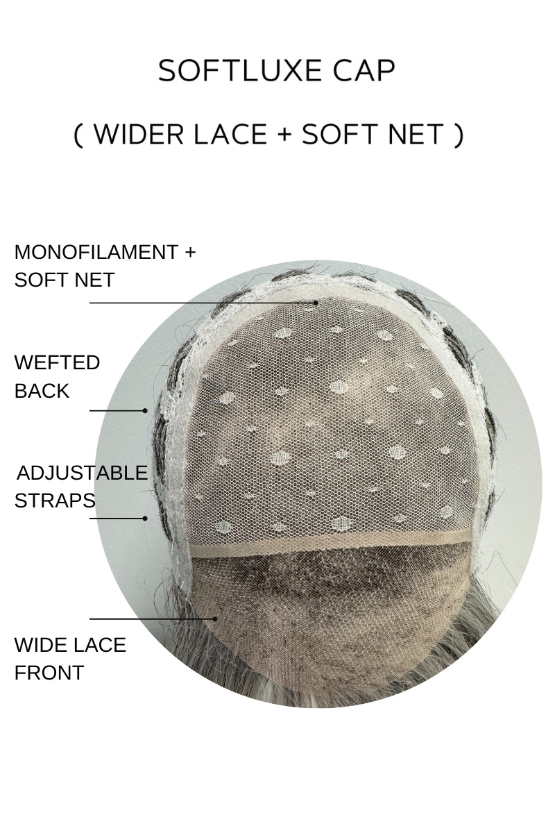 SoftLuxe Cap: This cap features a wide lace front and a soft net monofilament top, for a more delicate and durable feel while maintaining the same breathability as other caps. Natural Movement Hair Fiber: A combination of high-quality synthetic and heat-friendly hair fiber, creating a natural, subtle shine. Please note that this is a blended fiber piece and should not be treated like a heat-friendly piece but instead as a normal synthetic.