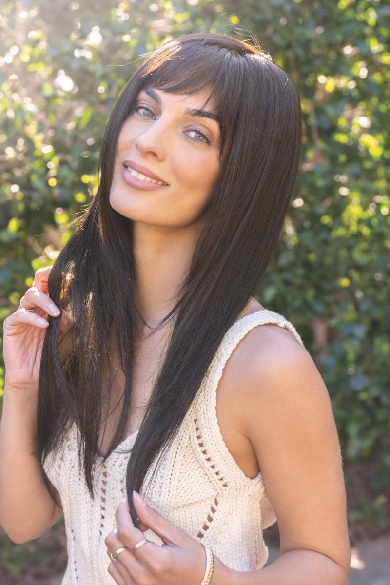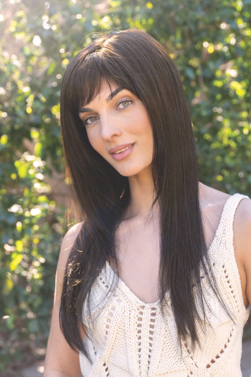 This straight ready-to-wear wig evokes a sensuous essence with its long flowing layers. Its Double Monofilament cap construction is combined with calibrated machine wefting along the sides and back. The cap includes polyurethane tape tabs along the front and adjustable tabs in the back neck area, to allow for comfortable fit. The result is a comfortable fit with a natural look that is both fashionable and easy to wear.