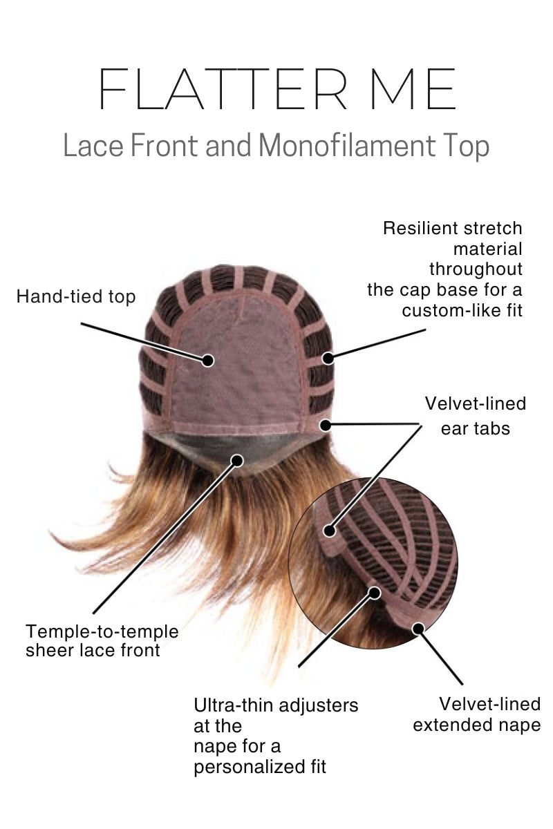 Temple-to-temple sheer lace along the front hairline allows the subtle bang to be worn forward or off the face.