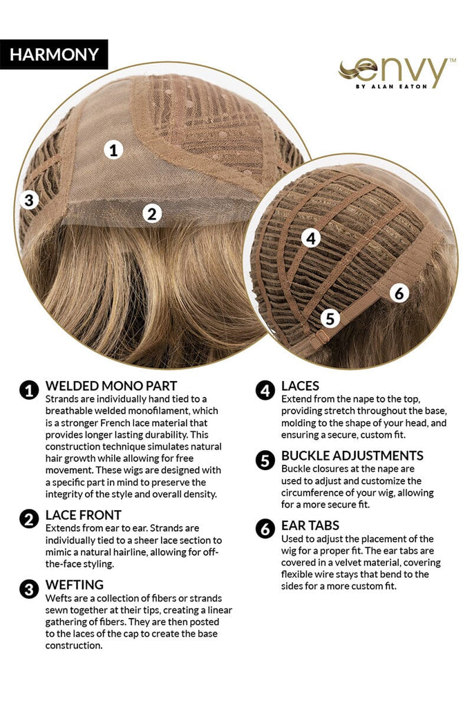 Harmony’s textured, flowing waves were meant to be tossed…. Our Lace Front Mono Part construction gives you those wispy bits at the hairline and one of the most realistic-looking parts on the market. This gal will never give away the secret that you’re wearing a wig.