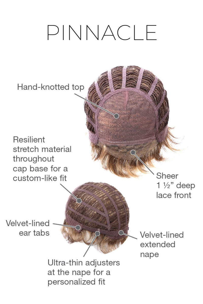 A modern take on a short basic cut, this full, softly waved, collar-length wig has a hand-knotted top for parting versatility and sheer lace front for natural looking, off-the-face styling.
