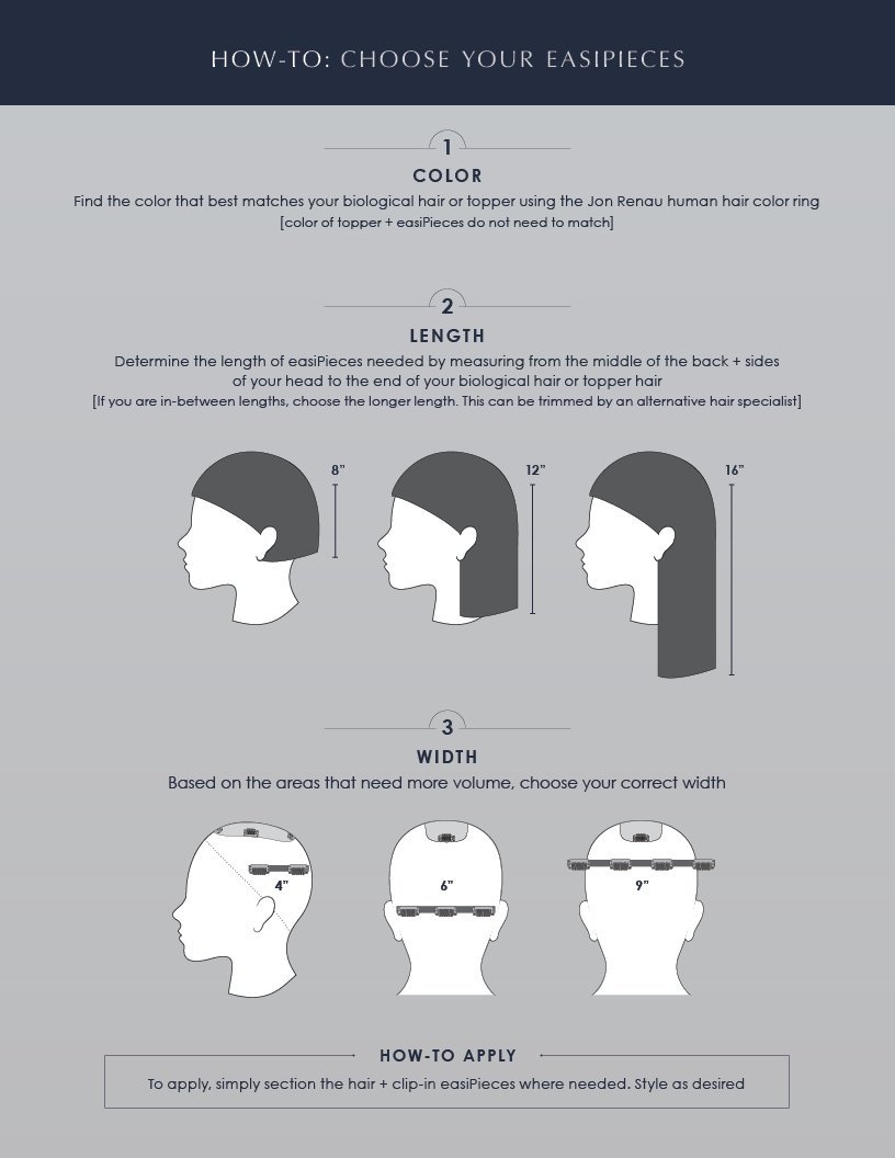 – easiPieces are available in three hair lengths: 8", 12" & 16" and widths: 4", 6" & 9" –