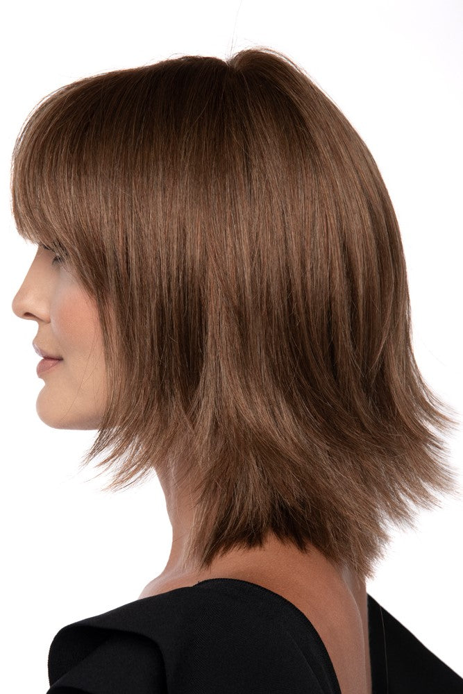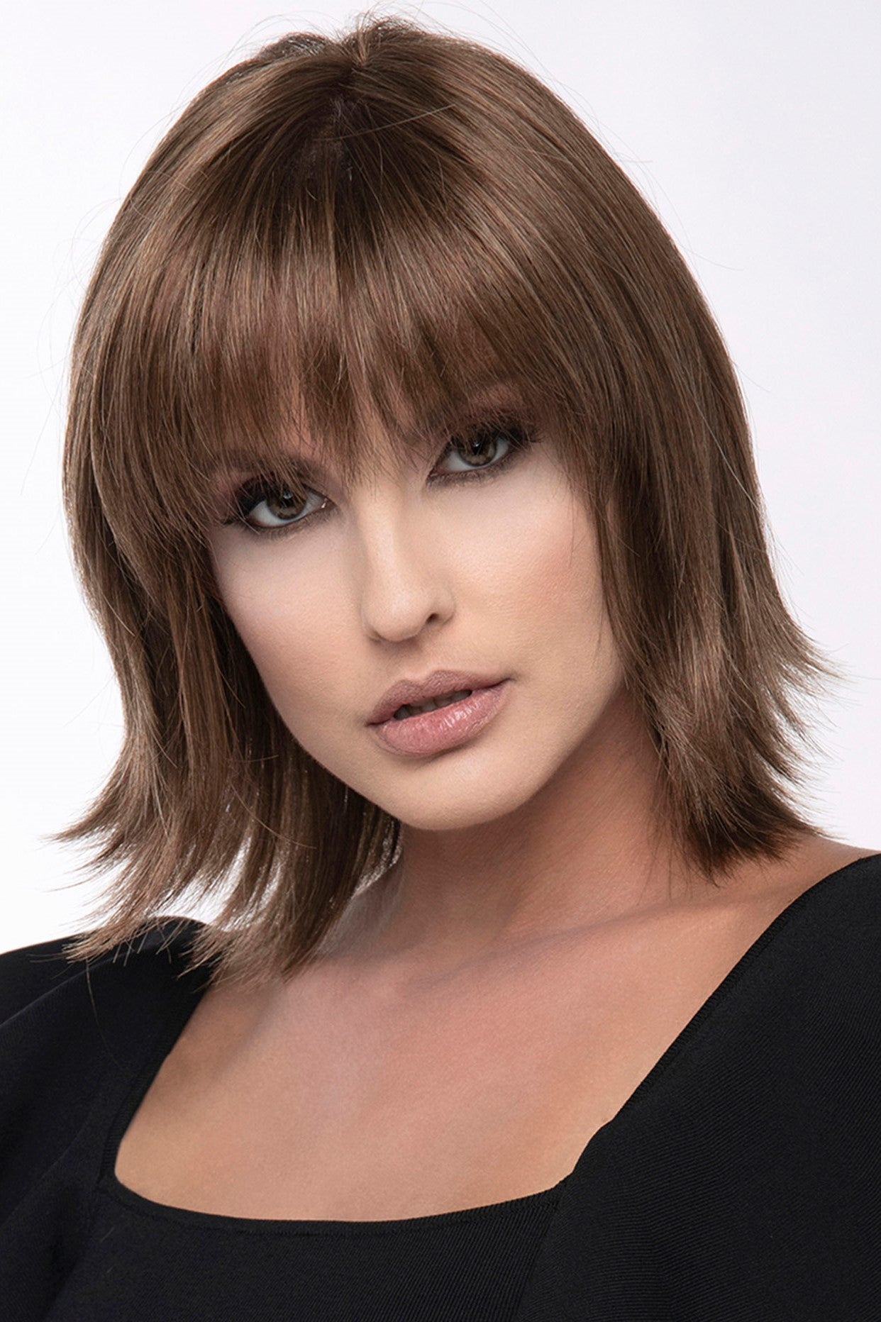 From textured bangs to the layers throughout – razored edges put the modern twist on this classic shape. Amber’s Lace Front Mono Top and smooth textured layers lets her wearer customize the style in many ways.