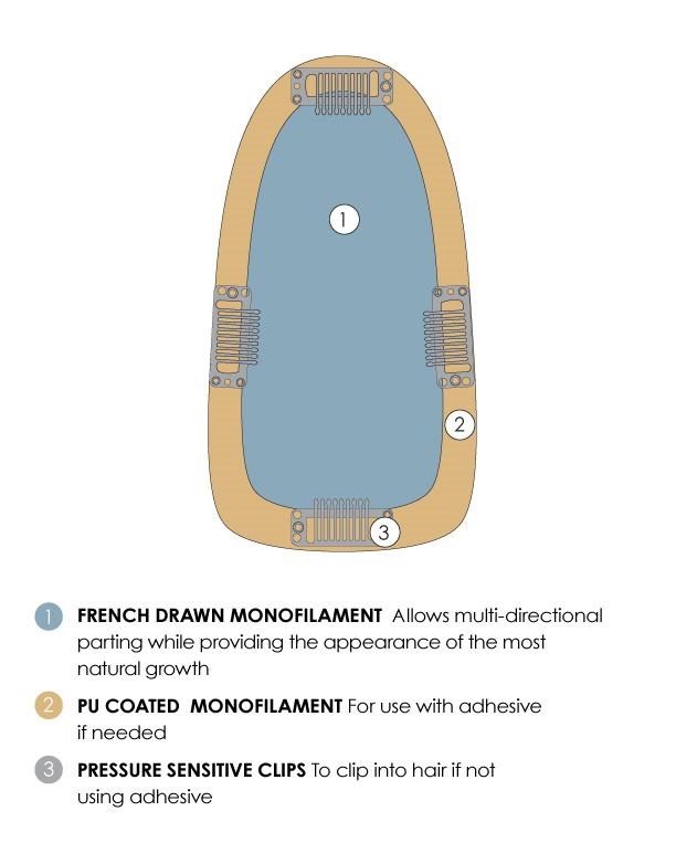 This clip in topper, worn over the part, adds volume to short styles with beautiful Remy human hair. The design is hand tied using French knotting, a superior knotting technique that creates the most natural appearance possible.