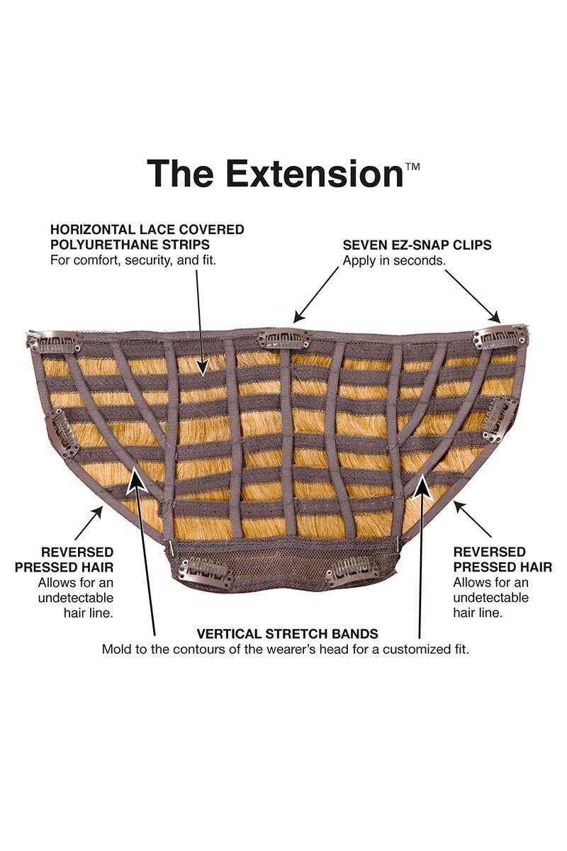 Why is it different: Unlike other products, The Extension™ has light flexible polyurethane lateral bands (wefts) covered with soft silk lace and stretch vertical bands for easy size adjustment that mold itself to the contours of your head. Hand crafted workmanship at the perimeter provides an undetectable hair line even if you pull back the sides into the super pony tail of your dreams.