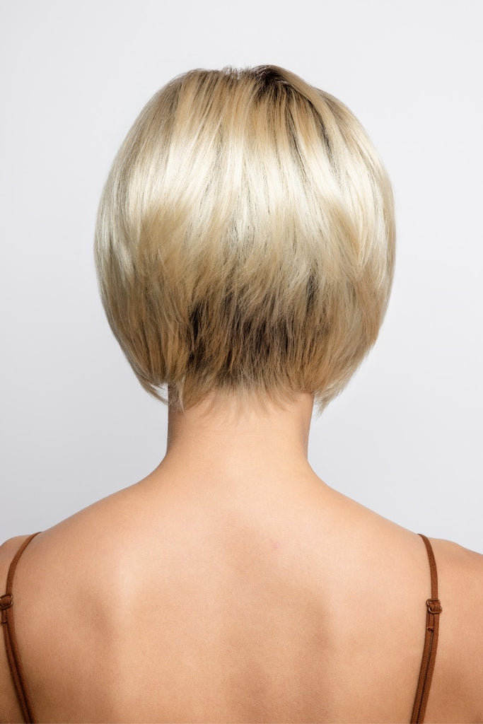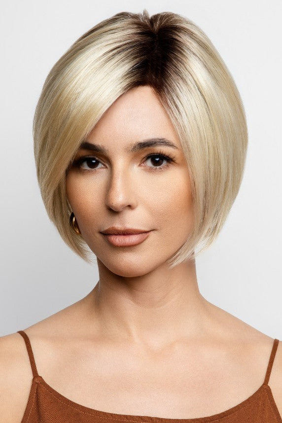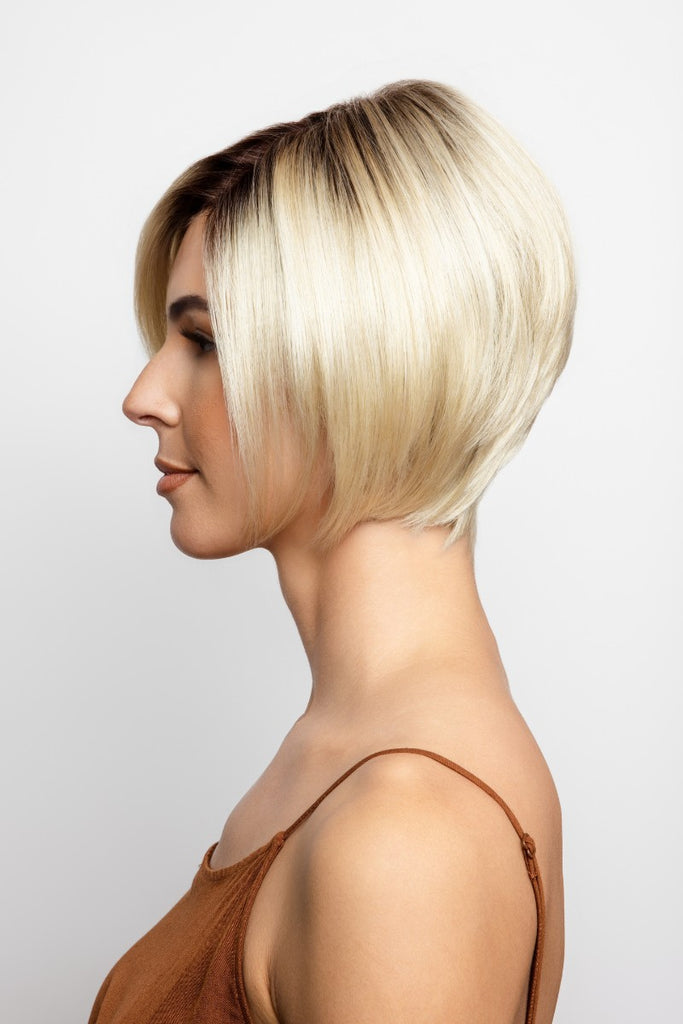 Emy from our Amore Collection is a short synthetic wig. This straight ready-to-wear wig is a short, angle bob. Volume can be added to the crown area to fit your face shape and for your daily wear look. Our Emy cap construction is Double Monofilament and lace front. The lace front is a hairline fusion technology with minimal lace front for a natural look. Its Double Monofilament cap construction is combined with calibrated machine wefting along the sides and back. Emy cap includes polyurethane tape tabs along the front and adjustable tabs in the back neck area, to allow for comfortable fit. The result is a comfortable fit with a natural look that is both fashionable and easy to wear.