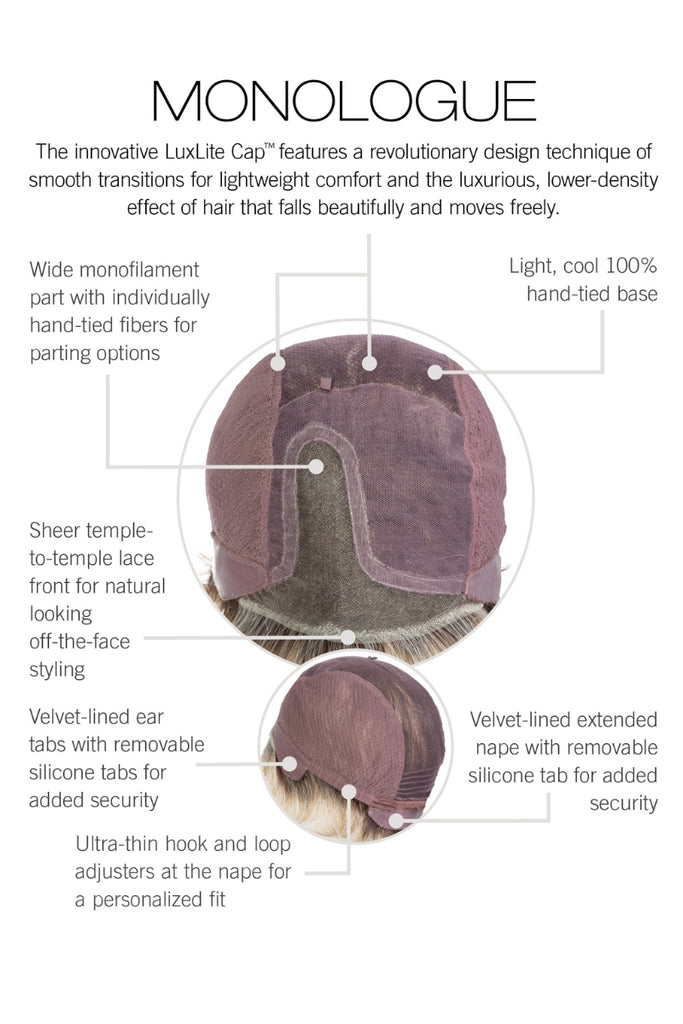 The LuxLite Cap: Features seamless transitions made with advanced, lightweight materials. This innovative design provides the comfort of a lower-density wig while achieving remarkable fullness. The LuxLite Cap is entirely hand-tied and includes a wide monofilament part along with a temple-to-temple sheer lace front. It is crafted with a petite to average circumference and utilizes unique stretch fabrics to ensure a comfortable fit for most head sizes.