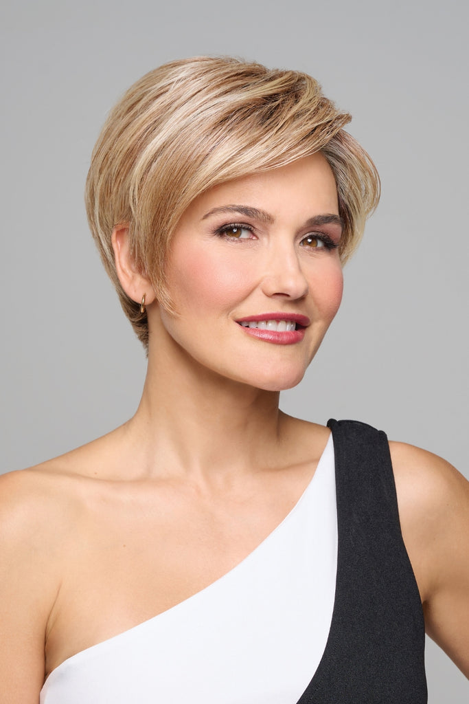 Experience luxury and comfort with Raquel Welch's - Monologue. This stunning pixie cut wig features a 100% hand tied cap, monofilament part, and temple to temple lace front for a seamless, natural look. Made from high-quality synthetic material, this wig is heat friendly for easy styling and lightweight for all-day wear. The straight, short style is perfect for a classic and timeless look, while the razor cut layers add a touch of modern flair. Get ready to feel confident and comfortable in this truly comfy and stylish wig!