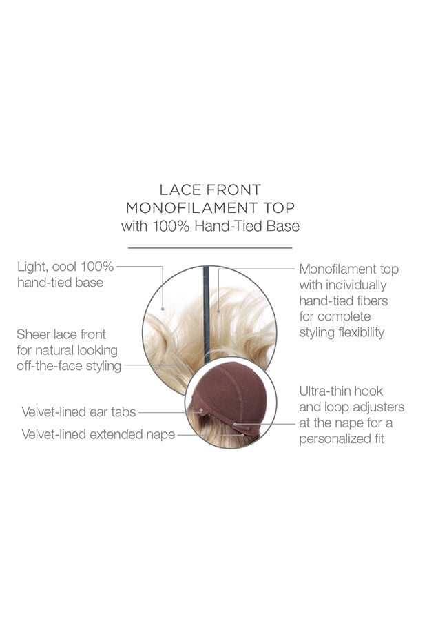 Exquisitely long and lush, this style is the epitome of classic length and wave. Our longest, hand tied wig to date, this trending look combines the natural looking hairline of a Sheer Indulgence™ lace front monofilament top for optional off-the-face styling with the cool, light comfort of a 100% hand tied base, The result is the ultimate in length and style without the time and effort it would take to style your own hair.