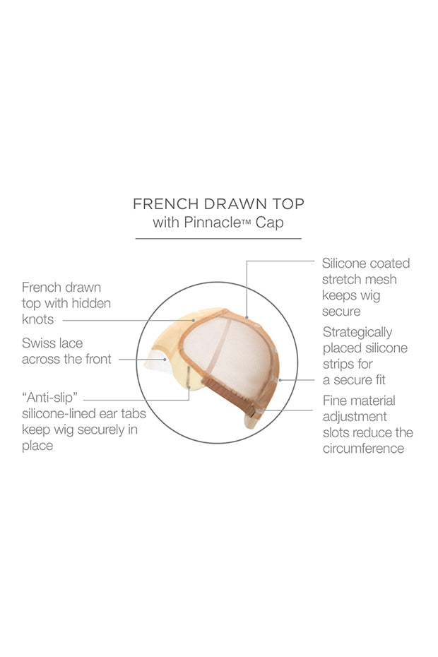 Pinnacle Cap: This cap construction features a French-drawn top, composed of three layers of material: two outer layers made of nylon silk and a central layer of Swiss lace. The intricate Swiss lace front provides a delicate and luxurious appearance, with smaller holes than typical lace fronts, resulting in an almost invisible transition.