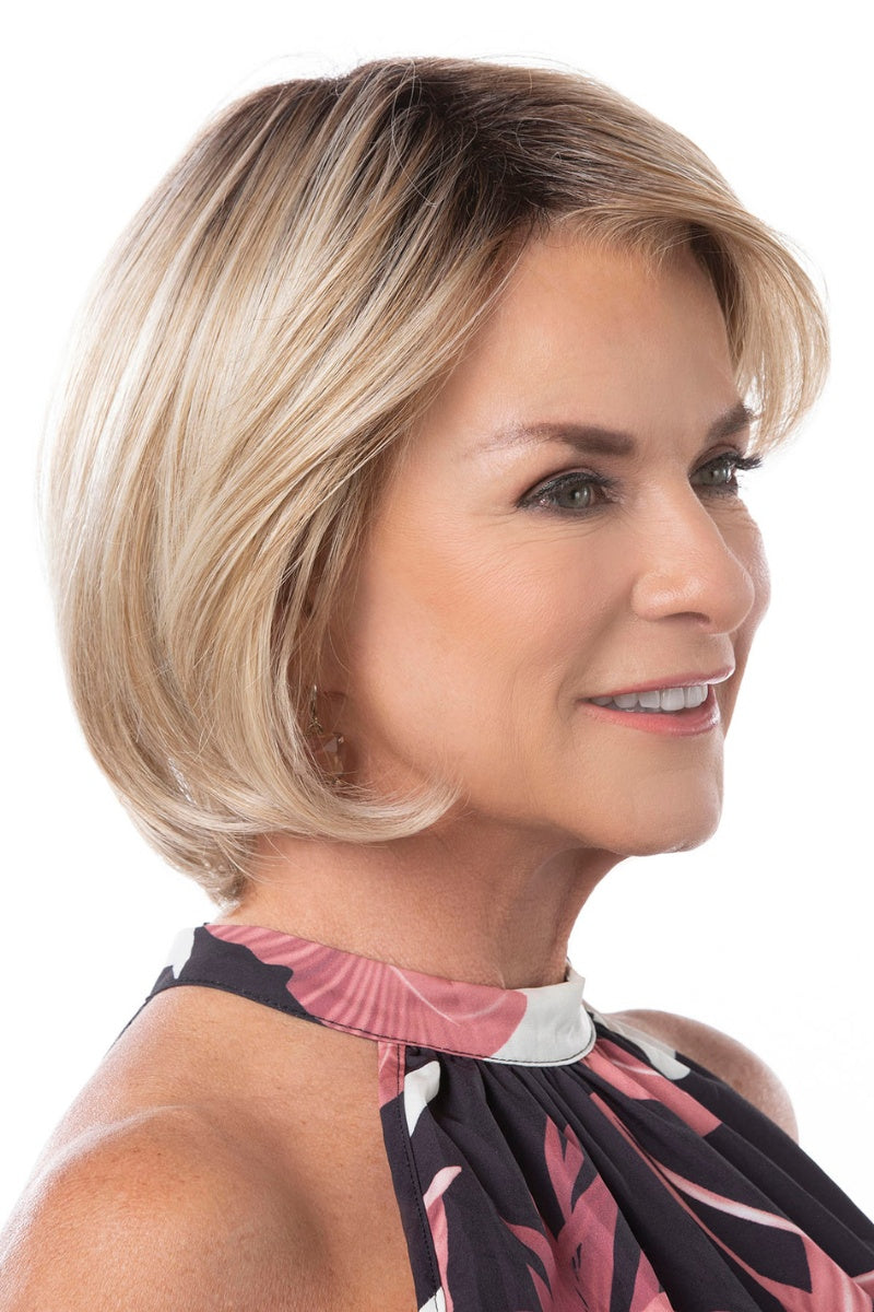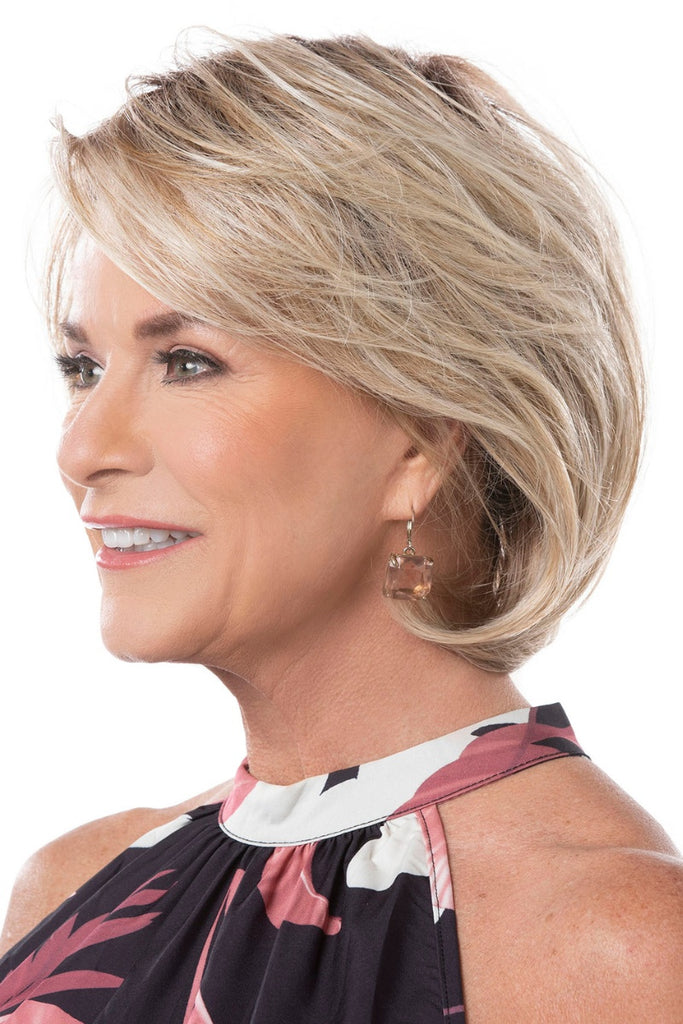 Get ready to fall in love with the Toni Brattin Flattering Plus Wig! This wig features a softly sculpted chin-length bob cut with a chic side-swept bang and sleek layering throughout. Its fresh and free-flowing silhouette is perfect for achieving that effortless and airy look when tucked behind the ear. Plus, the on-trend style frames the face beautifully and is perfect for a day out or a night on the town. You'll feel carefree and stylish with its chin-length crop and blunt cut sides and back, making it the perfect choice for today's natural trend.