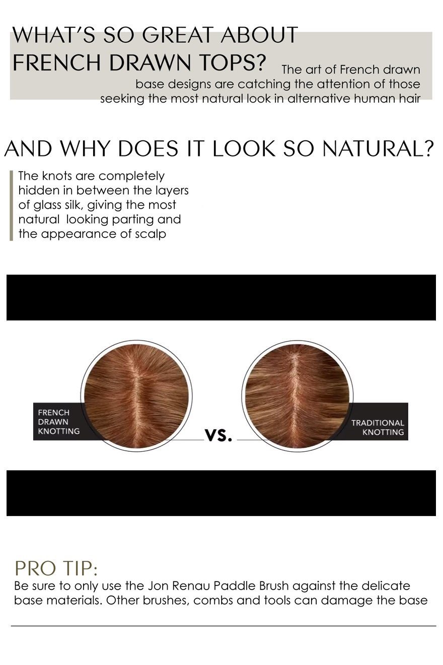 This clip in topper, worn over the part, adds volume to long styles with beautiful Remy human hair. The design is hand tied using French knotting, a superior knotting technique that creates the most natural appearance possible.