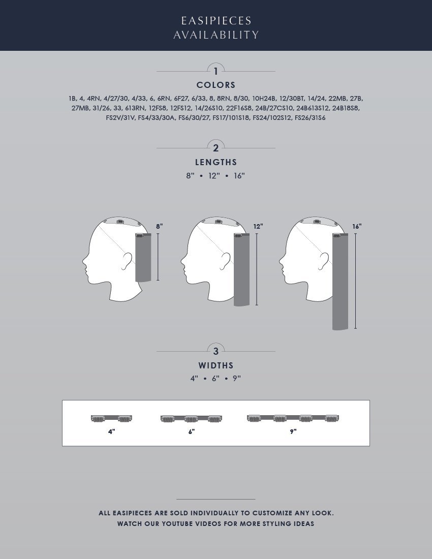 – easiPieces are available in three hair lengths: 8", 12" & 16" and widths: 4", 6" & 9"