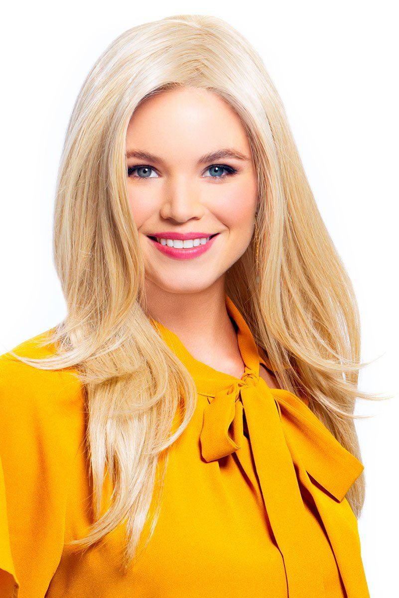 Sensational part-anywhere face framing bangs graduate into feathered layers that fall to the mid back. A Sheer Comfort cap with a hand knotted soft monofilament mesh and ear to ear lace front designed for an undetectable hair line. All day, every-day comfort and the styling versatility to brush back off the face and even pull your hair into a pony-tail.