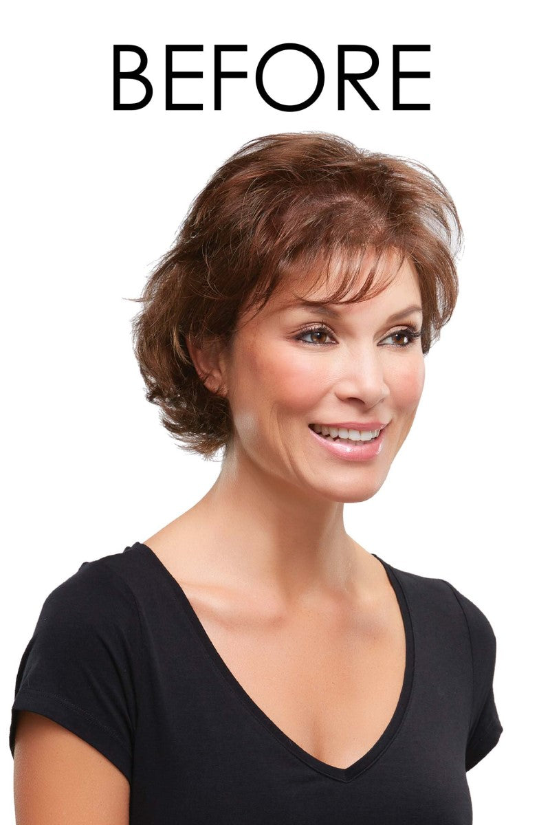 Reinvent your style with Jon Renau's Top Notch HD topper! This straight, voluminous topper features a long bob cut with bangs to help create a modern and stylish look. Crafted with a double monofilament cap and heat friendly fibers for added styling flexibility this topper is a perfect fit for mid-progressive hair loss. Bring your confidence back and experience unparalleled comfort and confidence with Top Notch HD--the perfect choice for your next look!