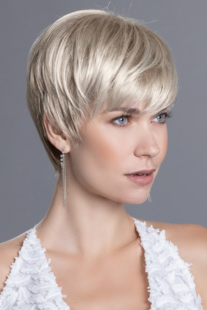 The Pixie wig from the Ellen Wille Changes collection is a super classic, short style. Pixie is light as a feather and incredibly comfortable to wear. To ensure this style is cool and as light weight as possible, the main body has open wefts meaning the hair has been stitched by machine onto very thin strips. The bangs are delicately thinned out so it doesn't sit too heavy on your forehead. The crown area has layers that have been textured so that they have a lifelike, low density. Along with a  small monofilament crown circle, which allows the hair have a natural growth pattern. Finishing with a nice snug tapered hairline. A true no fuss shake and go wig right out of the box.