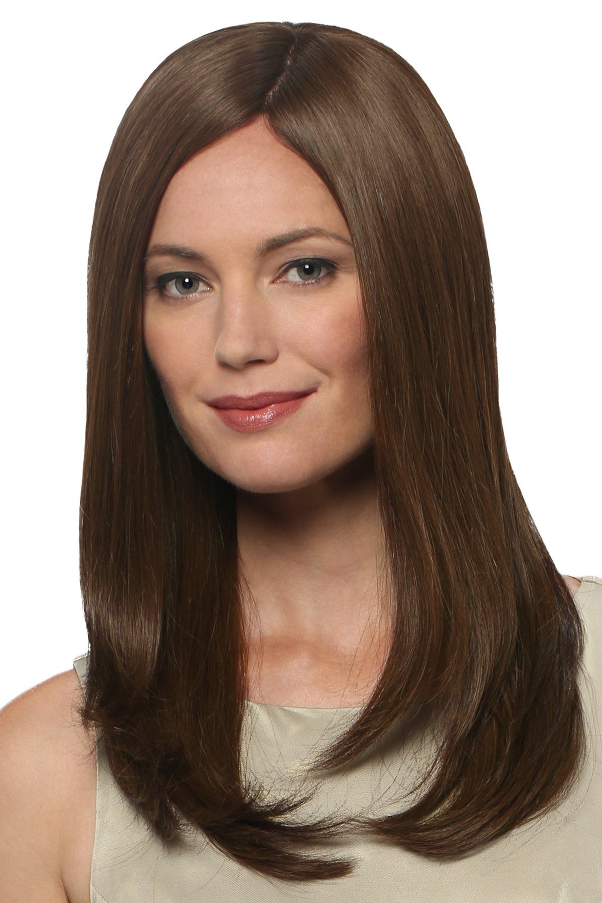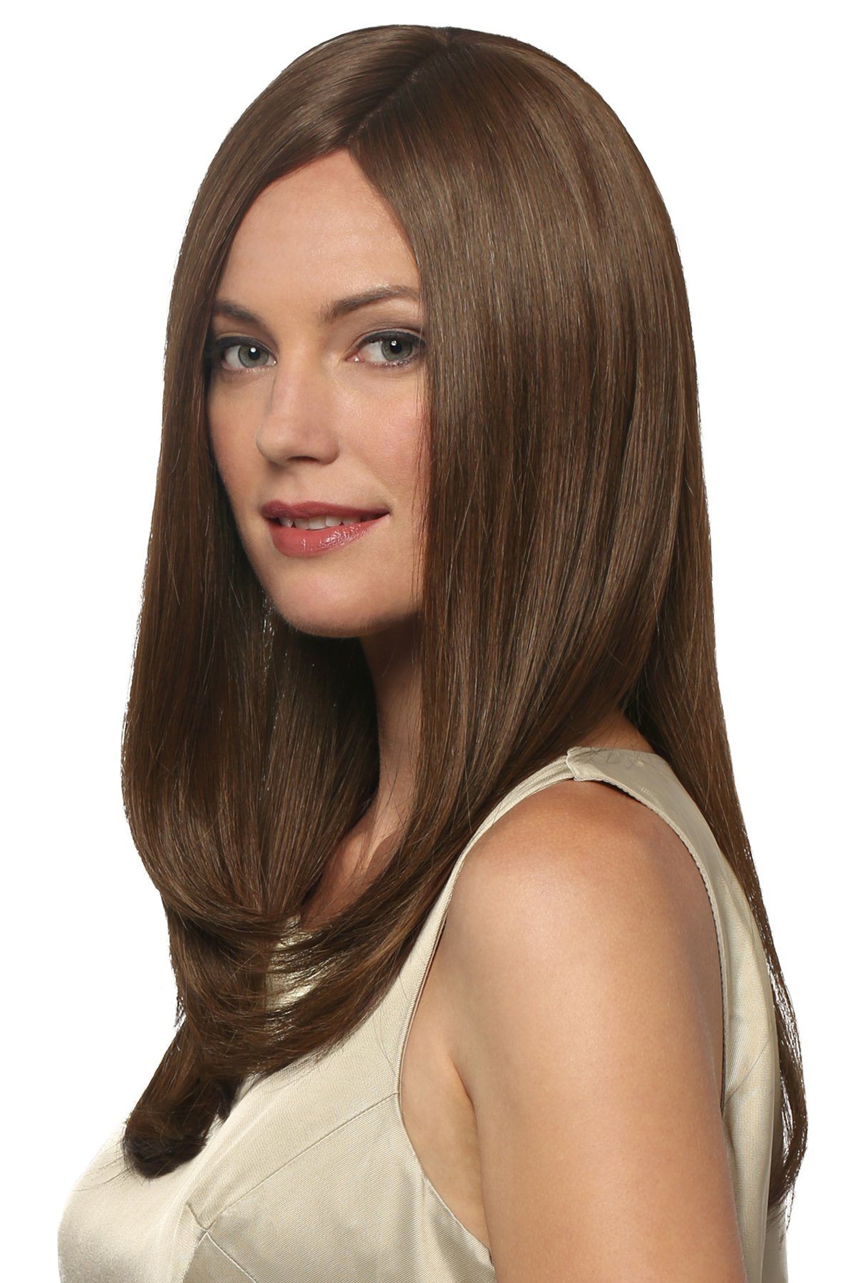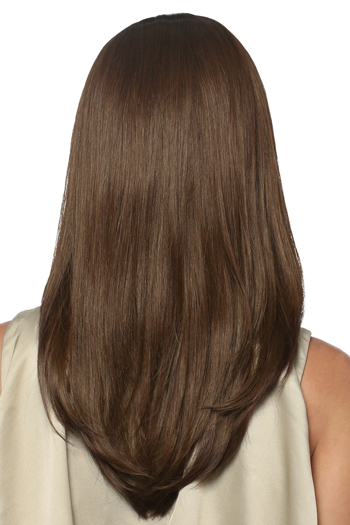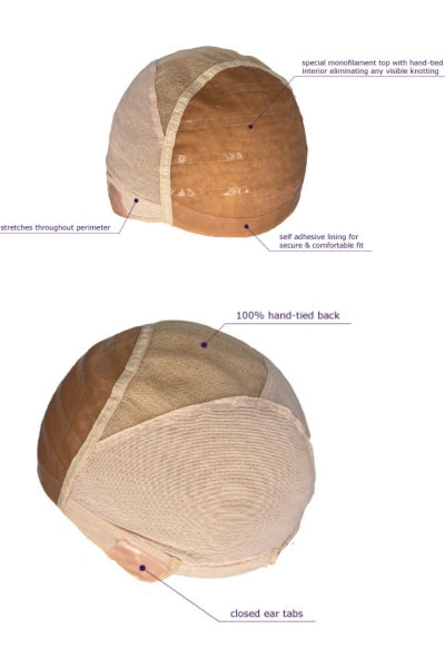 Straight long semi-layered cut wig. Soft self adhesive lining for secure and comfortable fit, specially constructed monofilament top with unique handtied interior which eliminates any visible knotting, stretches throughout the entire perimeter of the cap.