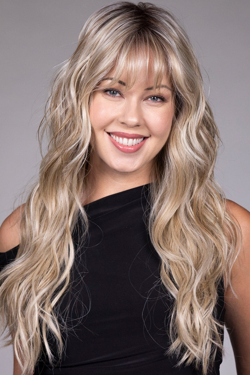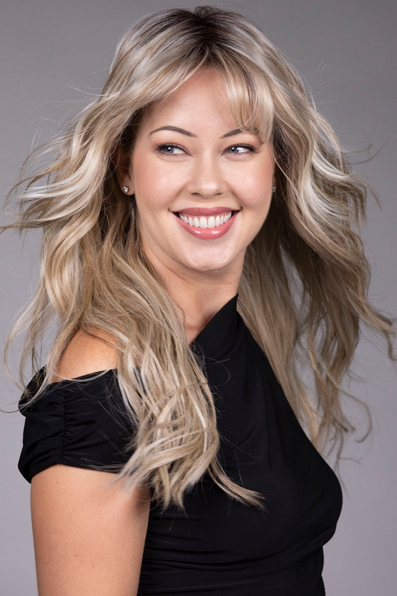 Gaia by Belle Tress is a long, layered, wavy wig with straight-across bangs designed for natural movement and modern style. Made with heat-friendly synthetic fiber, this wig allows for low-heat styling while maintaining its soft, salon-finished look. The extended lace front creates a realistic, seamless hairline, while the monofilament top provides natural-looking parting and scalp appearance. Fully hand-tied construction ensures lightweight comfort and lifelike movement, making Gaia an ideal choice for everyday wear or special occasions.