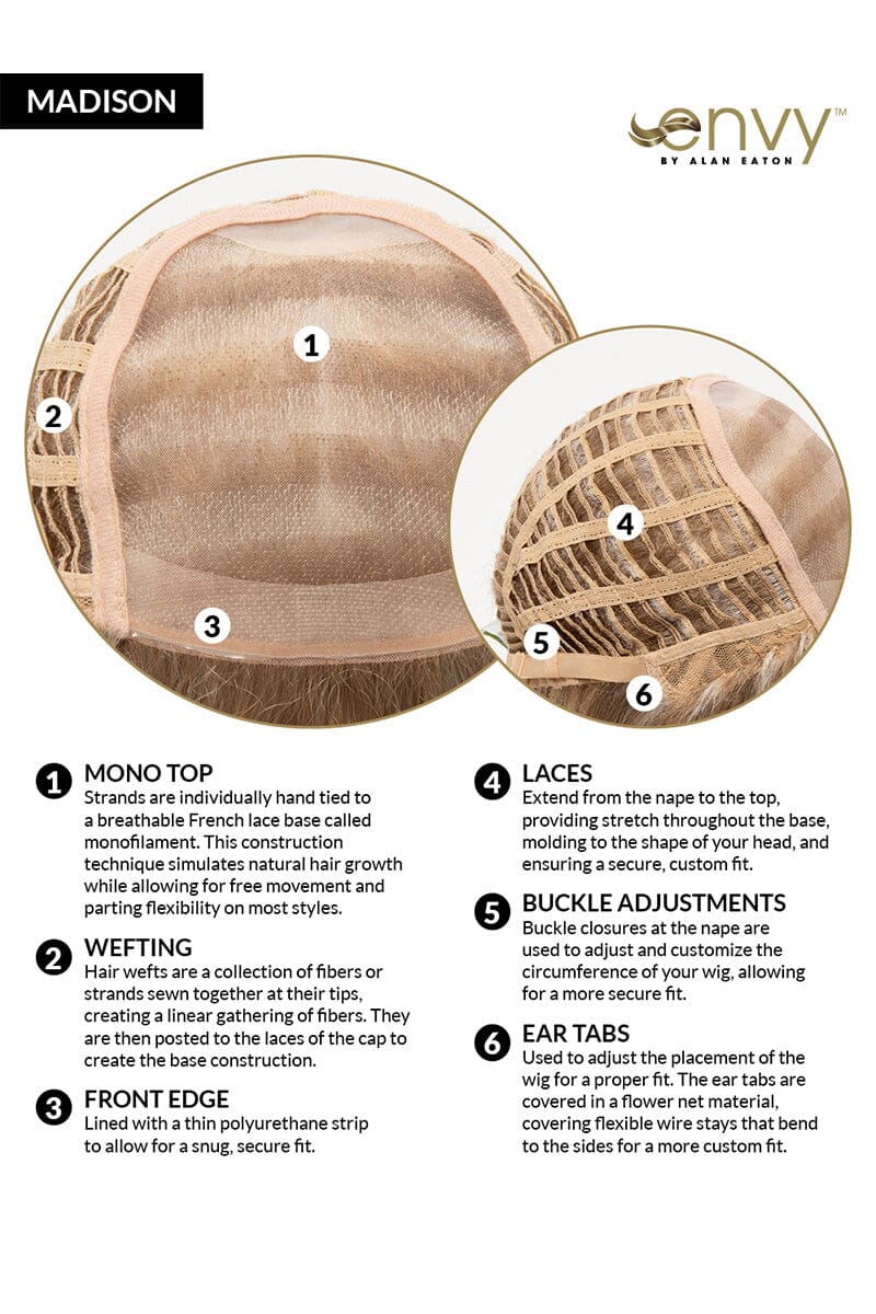 Madison by Envy offers face-framing layers, razored at the edges to create a soft, natural appearance. Mono Top construction allows the wearer to feel confident that she’s stepping out in the most believably natural-looking style available.