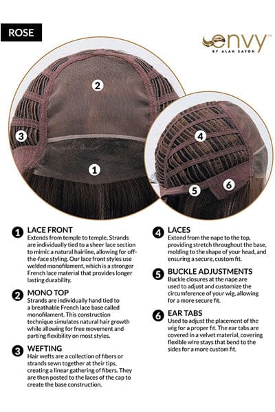 Lace Front with mono top cap construction allows Rose’s wearer to customize sweeping bangs and face framing layers to put movement in all the right places. These features, along with adjustable nape straps, give customizable carefree style day or night.
