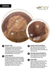 With her classic silhouette and long, blunt layers, Sophia by Envy can be worn straight from the box or taken to your favorite stylist for full customization. No matter how you wear her, the 100% Human Hair, hand-tied construction will look and feel just as though it grew from your own head.