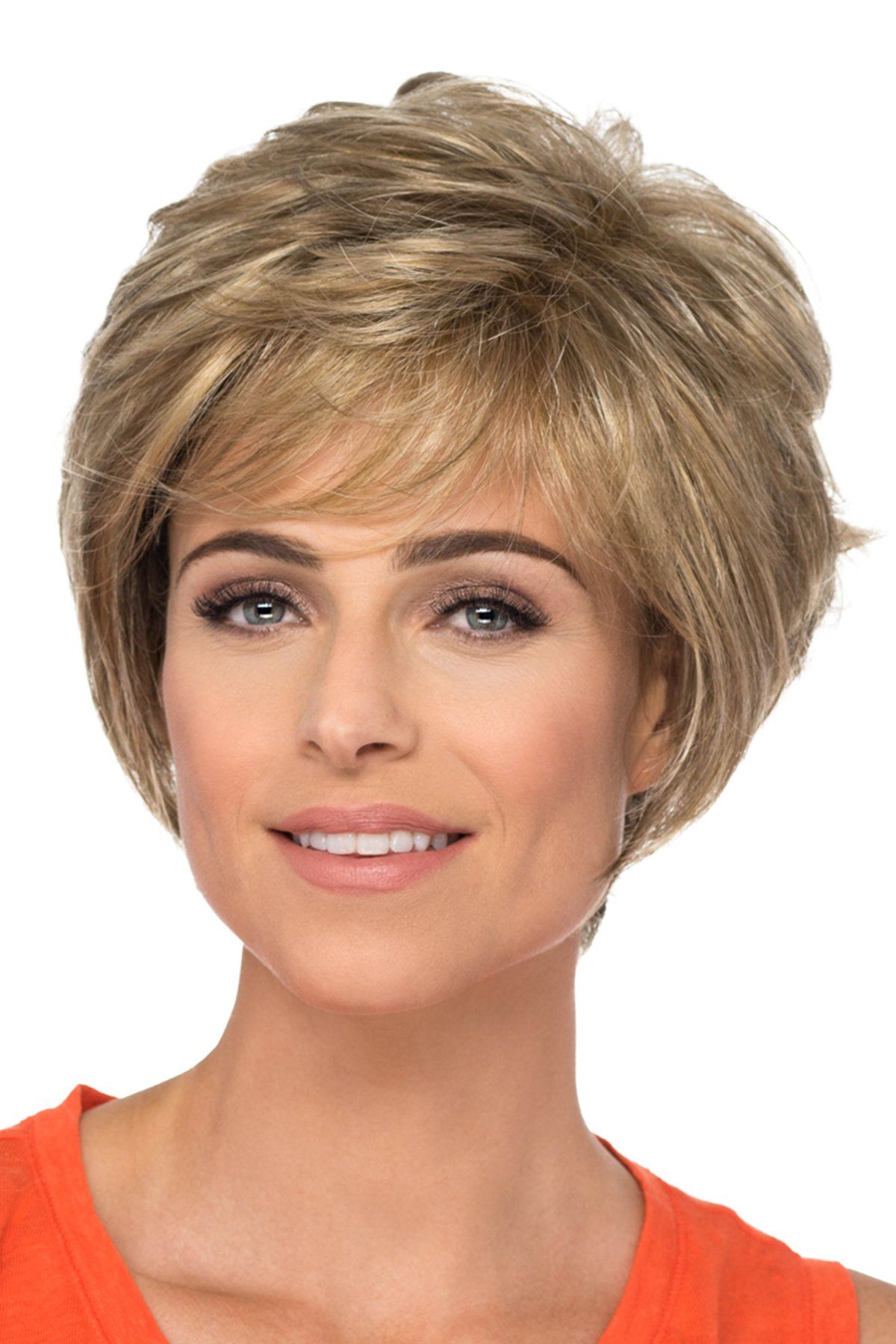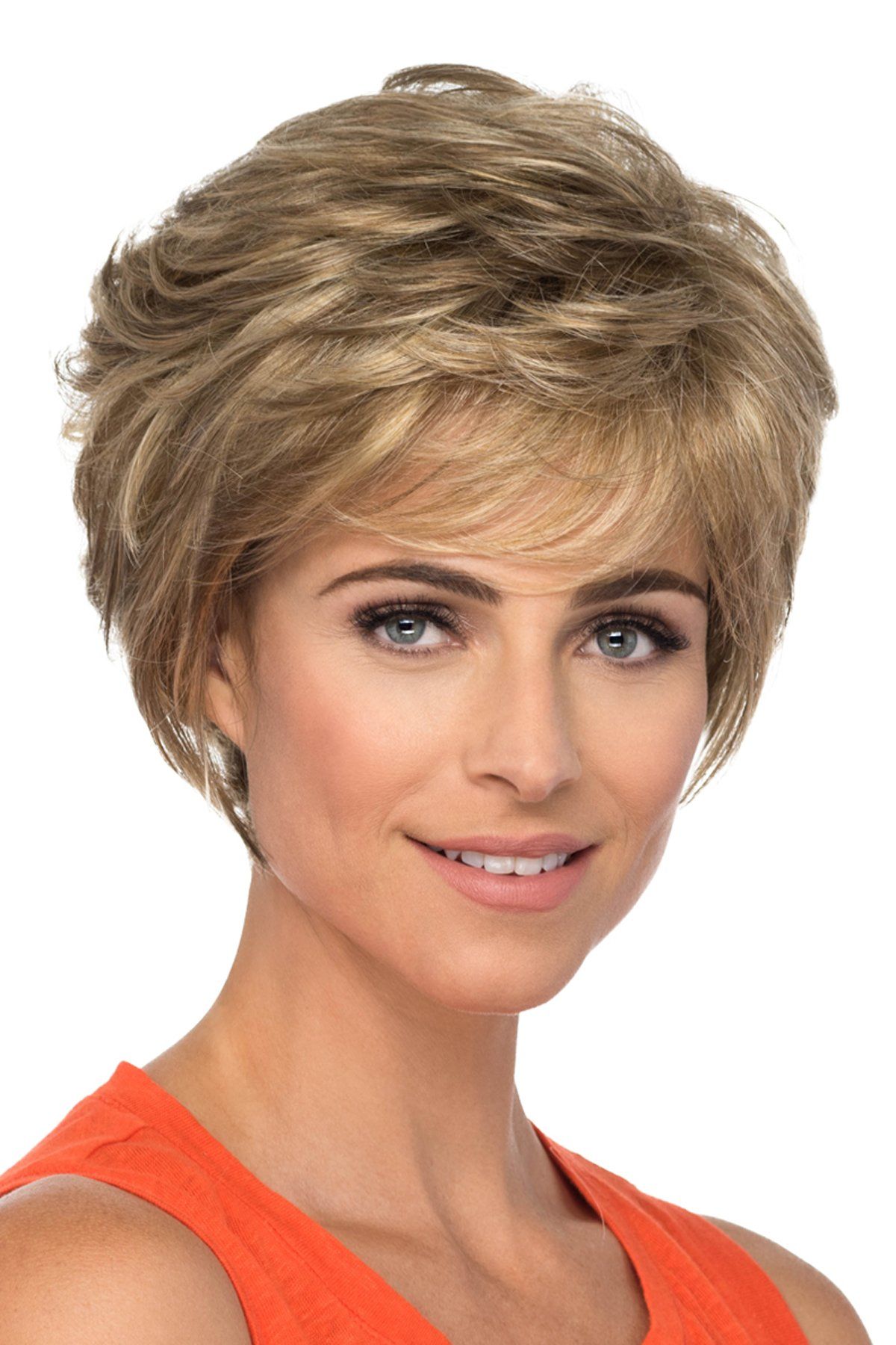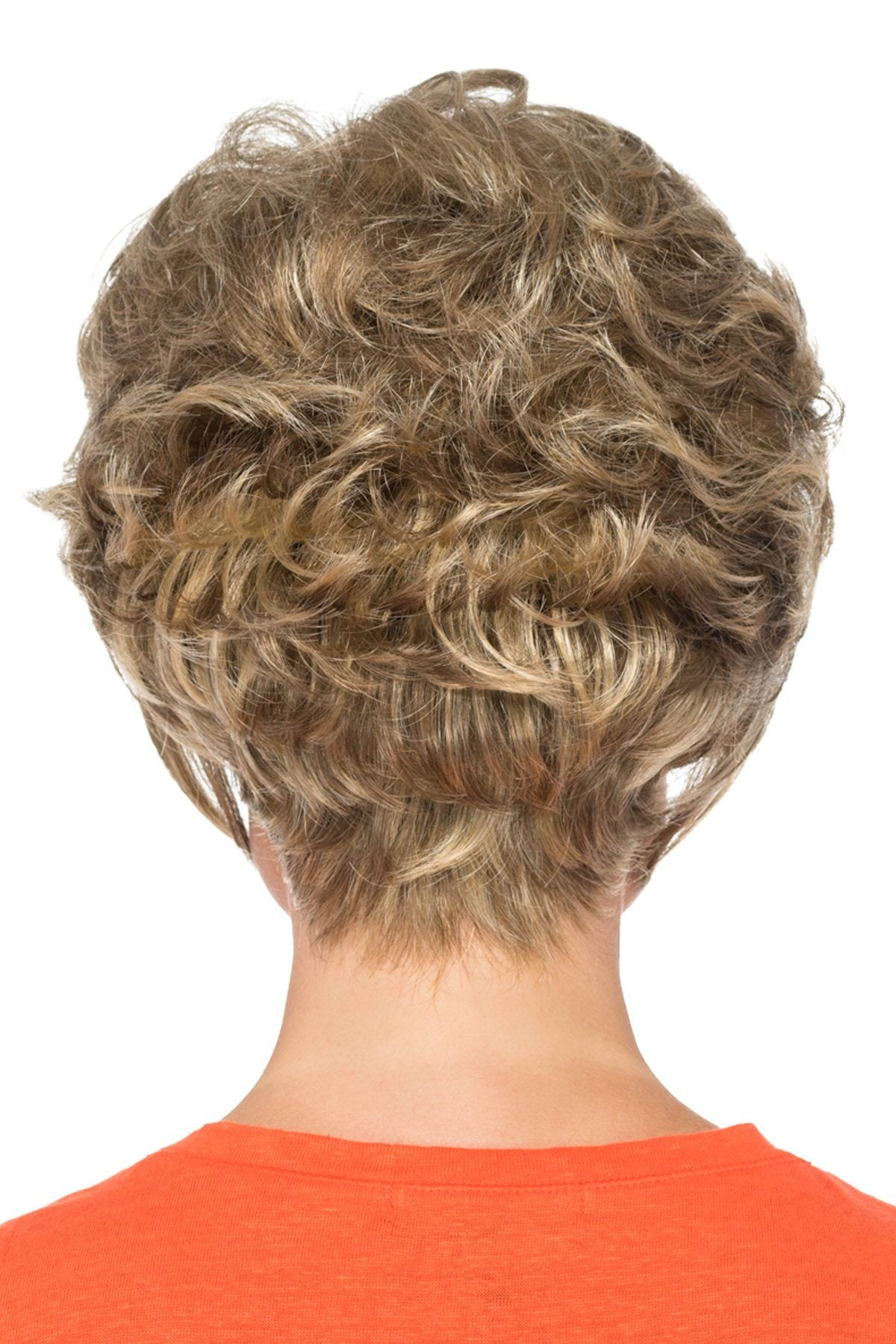 Short pixie style wig with loose curls, wispy long sides, and tapered nape. Lace Front.