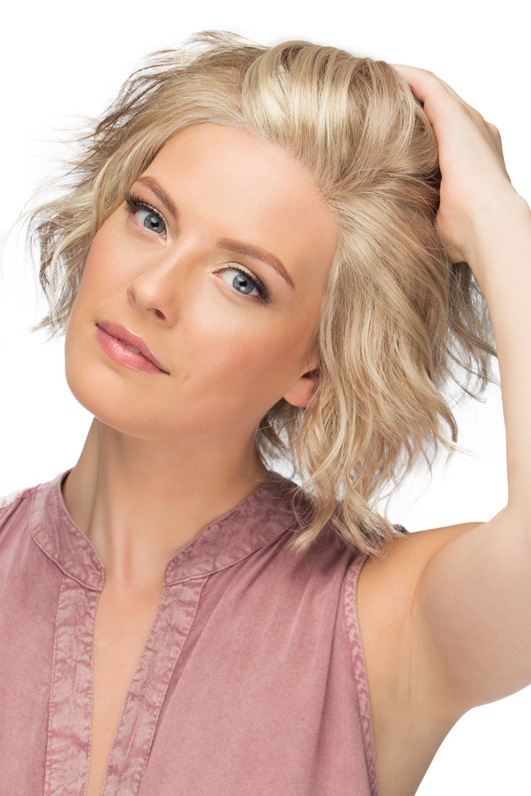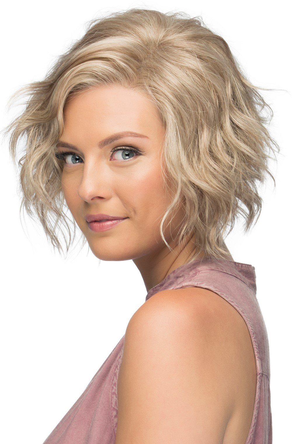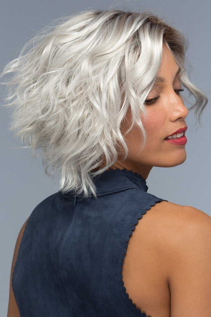 Wynter by Estetica is a short, angled cut bob with long side swept bangs. Textured waves are paired with choppy layers for an edgy, chic look.