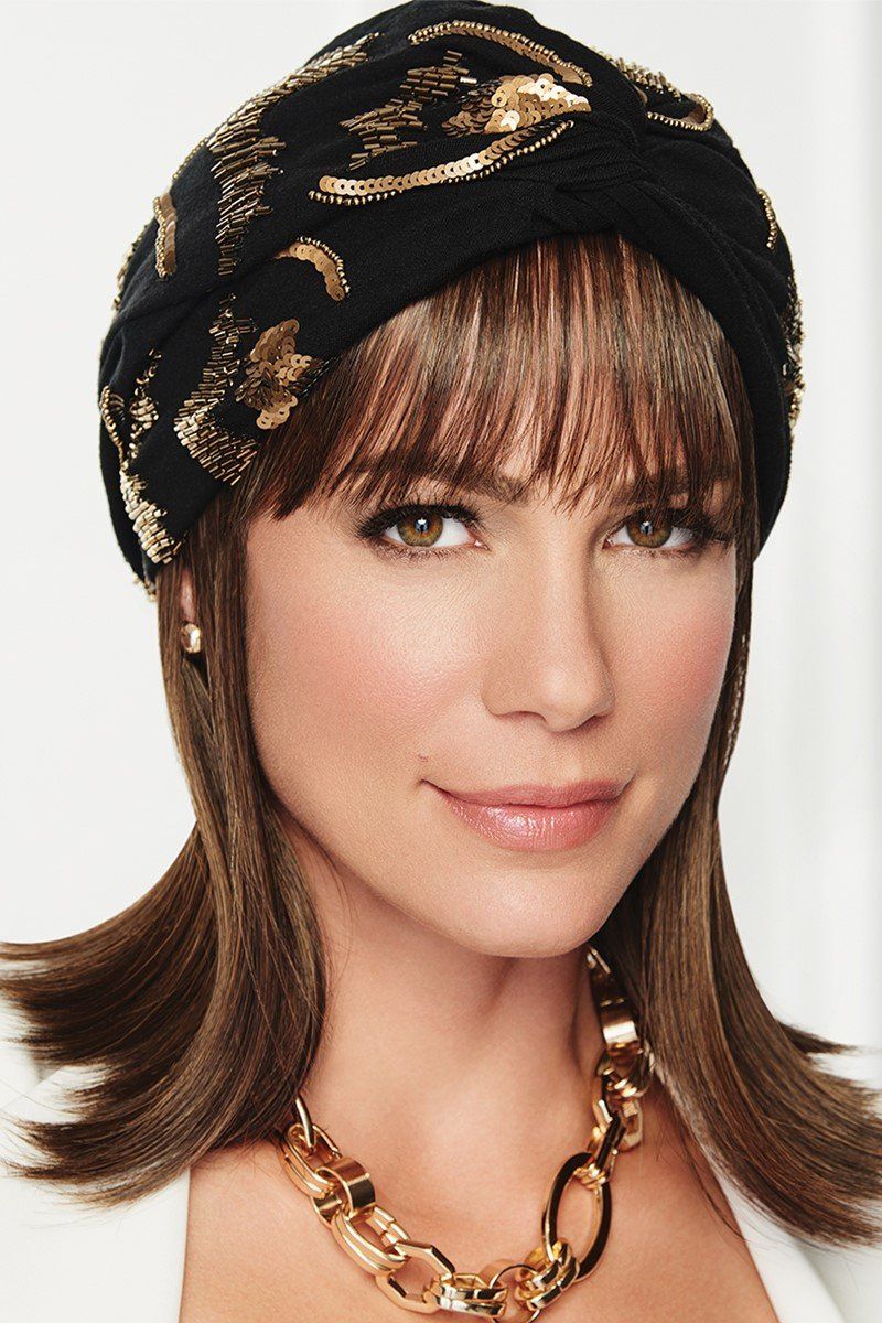 Designed to be worn with a cap, turban or other head wrap this piece offers a longer, shoulder-length style with softly textured ends. A detachable, feathered ‘eyelash’ bang can be worn with or without the halo depending on the look you want.