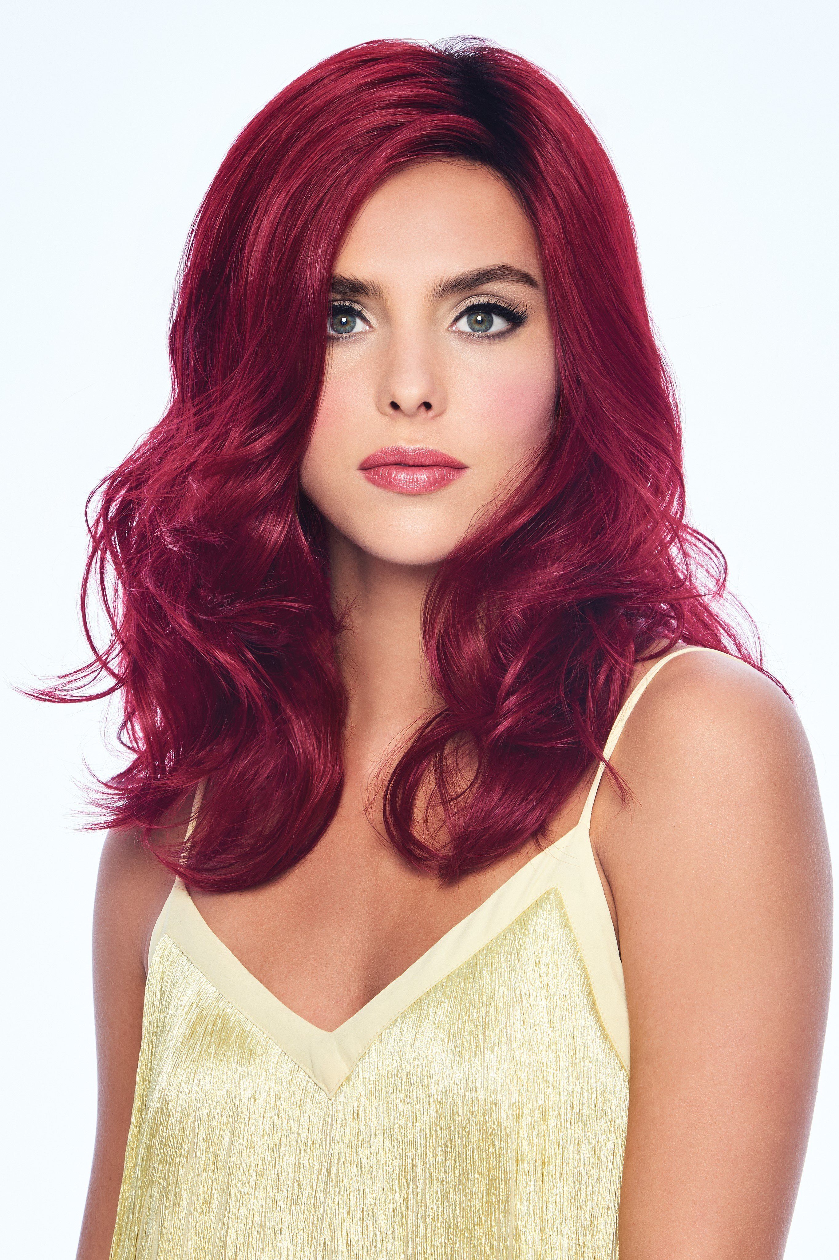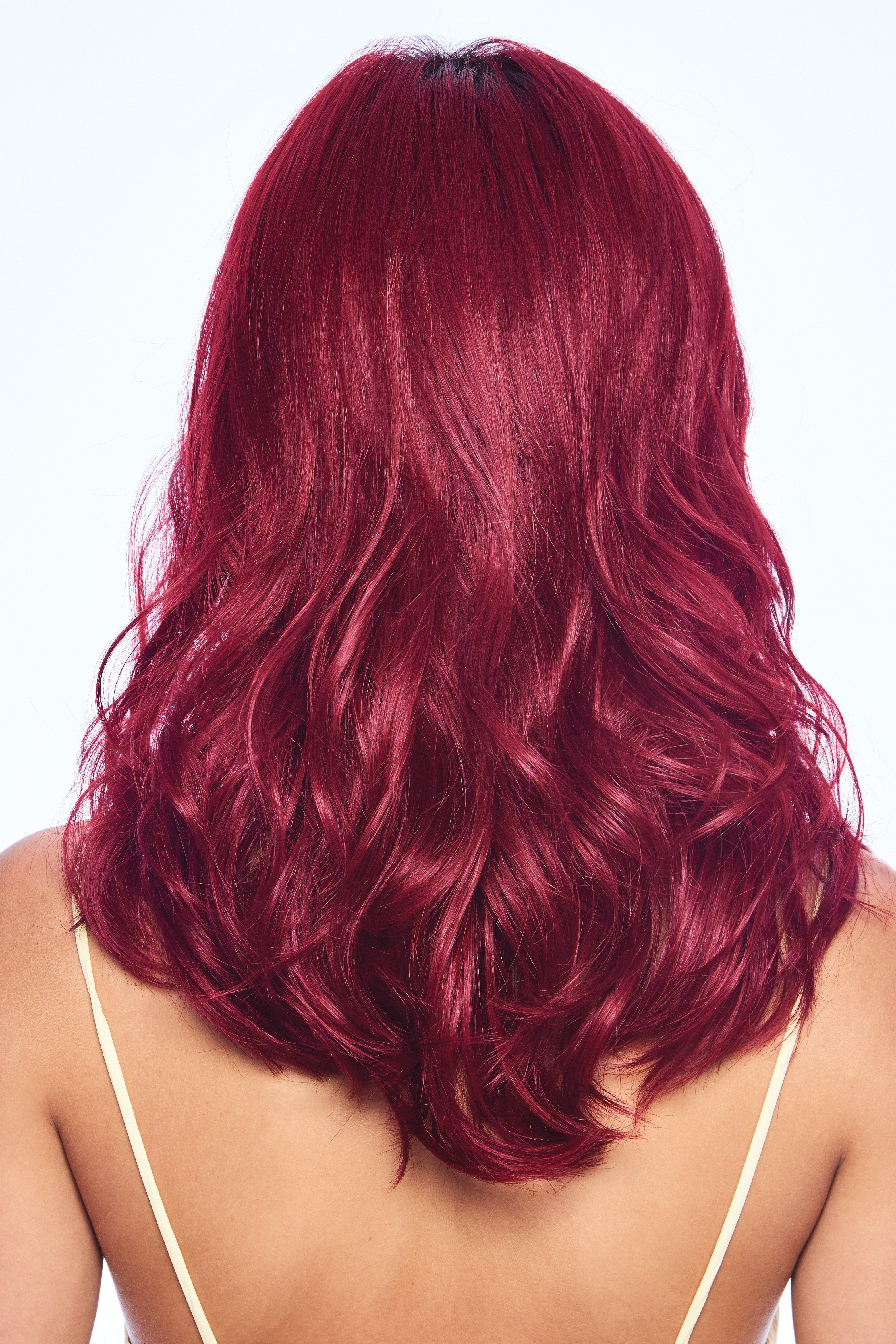 Long voluminous locks in an intoxicating cranberry red hue. Bombshell hair just got revamped, big time. This luscious, deep red is commitment-free, doesn’t fade and can be styled with a curling iron or flat iron.