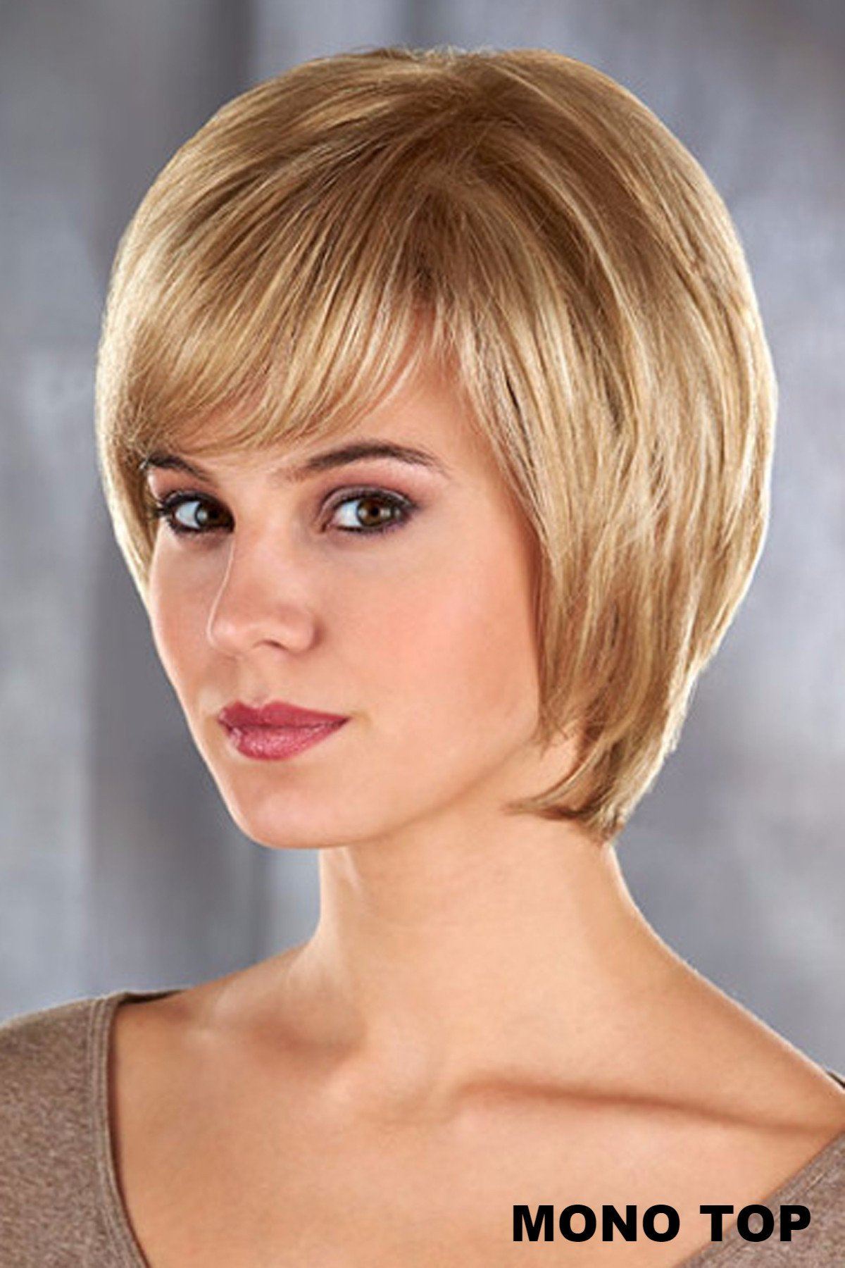 Synthetic wig with a monofilament top and medical application on front hairline and ear tabs.