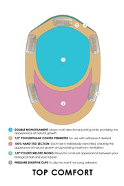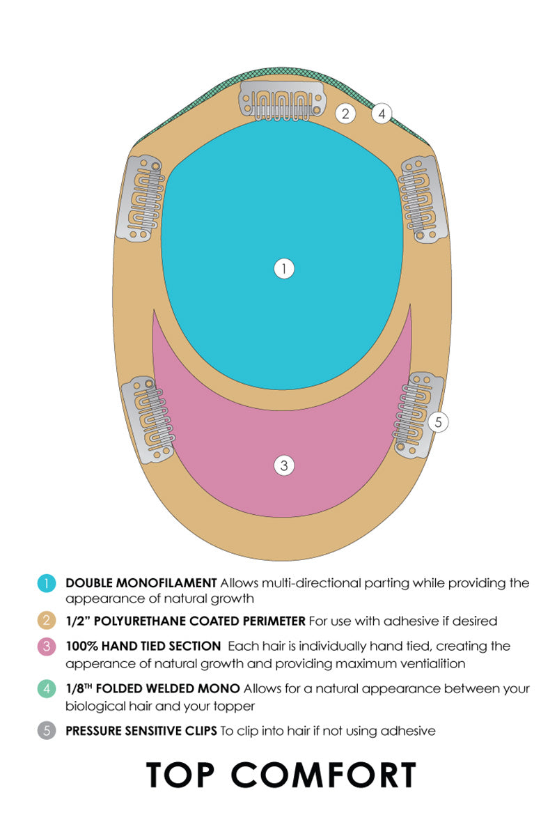 Designed with comfort as the number one goal, Top Comfort is made with a double monofilament top, silky smooth to the touch, and hand tied back for the most natural movement. Featuring premium Remy human hair, Top Comfort is ideal for those experiencing beginning to mid/progressive hair loss and looking for more coverage in the top and crown area. This topper features a double monofilament base, hand tied back, and an all-around larger polyurethane perimeter with five strategically placed pressure sensitive clips that can be removed if Tape 'N Go or adhesive is applied. Top Comfort has a 1/8" folded welded mono edge which allows for a natural appearance between your biological hair and topper.
