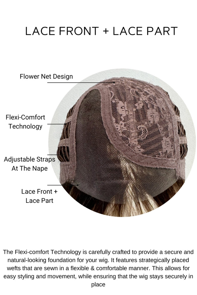Flexi-Comfort Technology: This cap construction has strategically placed wefts that are sewn in a flexible and comfortable manner, allowing for effortless styling and natural movement. Its design effectively distributes weight to eliminate discomfort and pressure points, ensuring a secure fit.