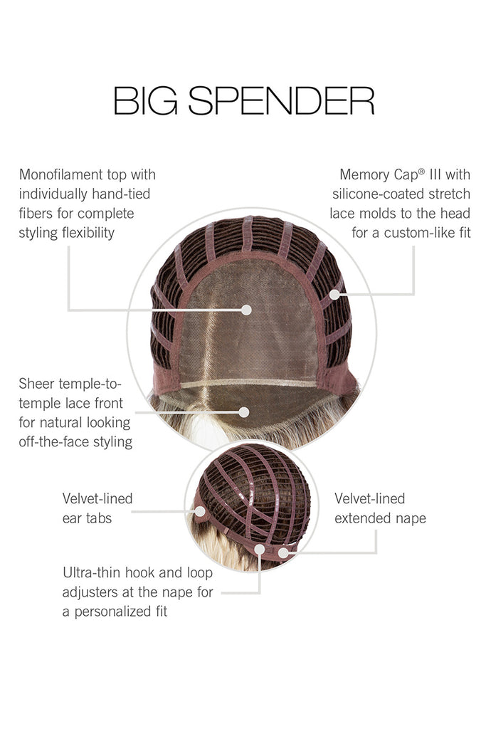 Look your absolute best with the Raquel Welch Big Spender! Soft, sophisticated waves make you feel like the only girl in the room. Constructed with hand tied, Tru2Life synthetic fibers that give you a natural look, and a temple-to-temple sheer lace front, this monofilament top and Memory Cap III features superior quality and confidence. Style in a page boy cut for maximum glamor!