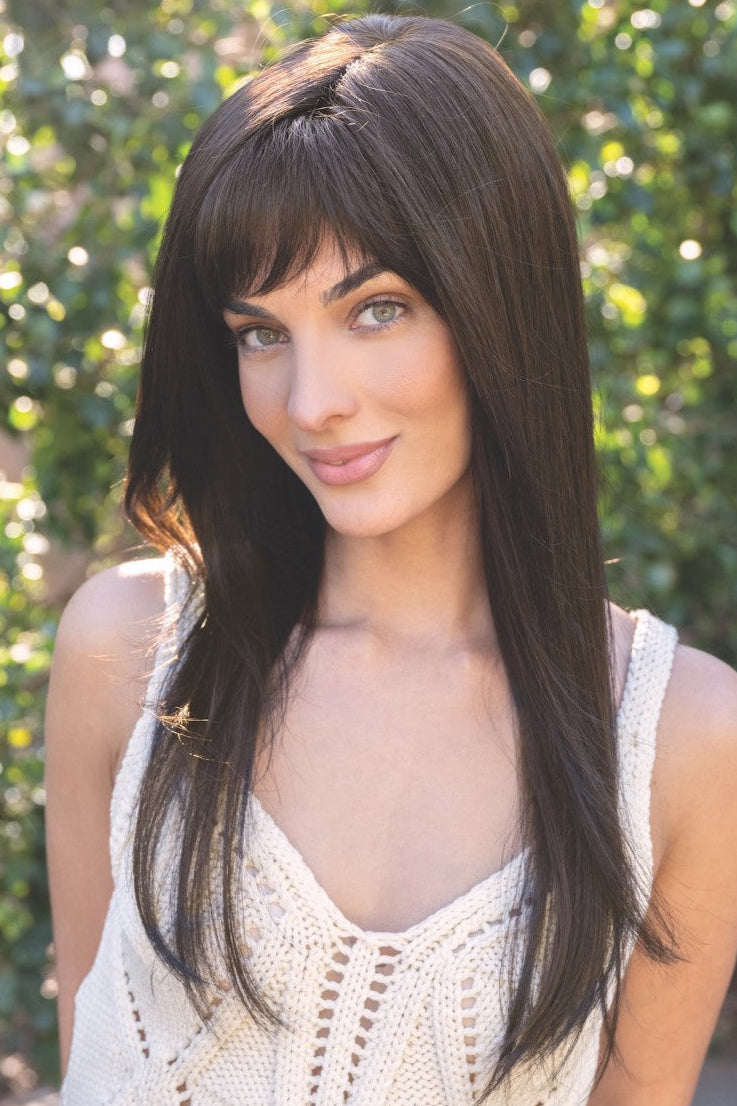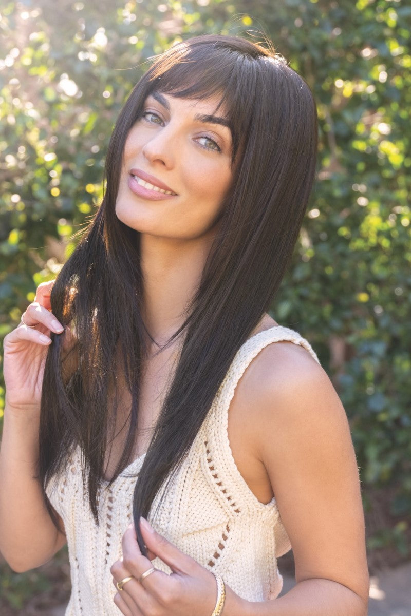 This straight ready-to-wear wig evokes a sensuous essence with its long flowing layers. Its Double Monofilament cap construction is combined with calibrated machine wefting along the sides and back. The cap includes polyurethane tape tabs along the front and adjustable tabs in the back neck area, to allow for comfortable fit. The result is a comfortable fit with a natural look that is both fashionable and easy to wear.