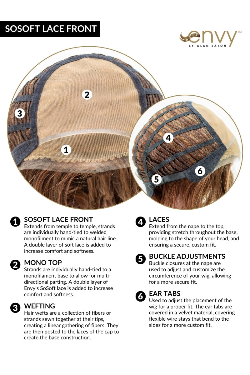 SoSoft Lace Front: Those with sensitive scalps can still enjoy the authenticity of Welded Lace wigs thanks to ENVY's SoSoft Lace Front design - which extends from temple to temple and includes a double layer of soft lace for all-day comfort and softness.