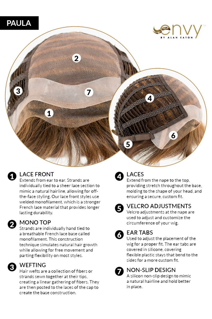 Paula's casual crop combines the advanced stylability of Envy's exclusive, heat-friendly EnvyHair™ blend, our hand-tied mono top construction for loads of believable movement, and an ear-to-ear lace front that provides the most natural looking hairline available. It’s a low-key way to get in on the asymmetrical trend —and the high-end look of 100% human hair.