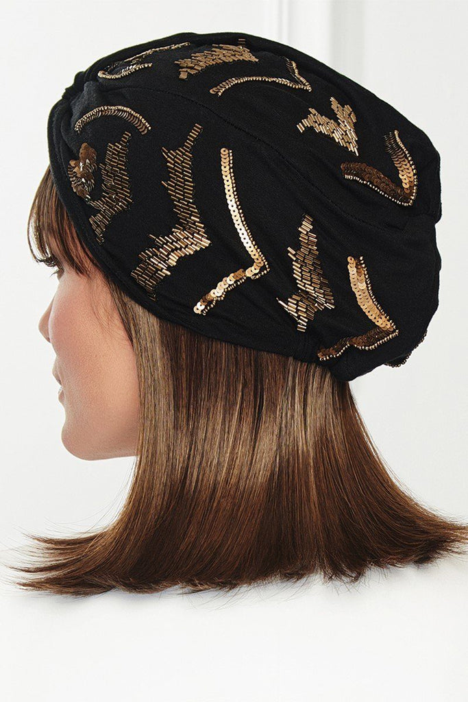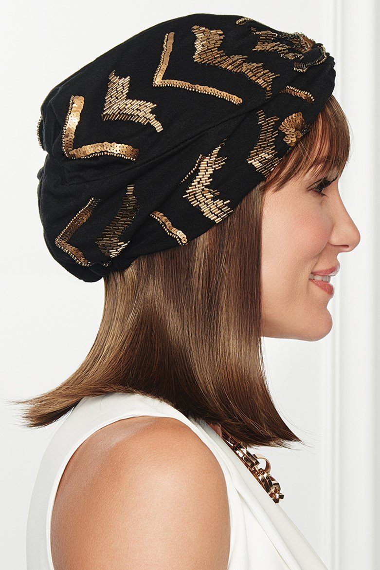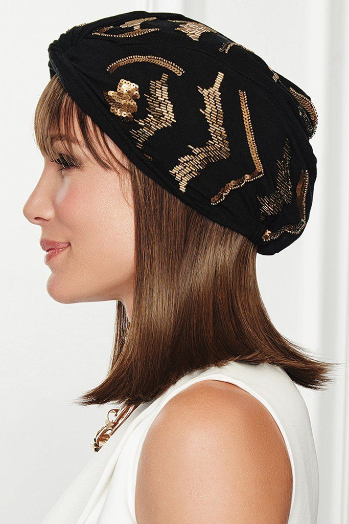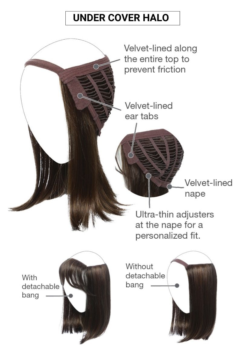 Designed to be worn with a cap, turban or other head wrap this piece offers a longer, shoulder-length style with softly textured ends. A detachable, feathered ‘eyelash’ bang can be worn with or without the halo depending on the look you want.