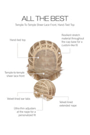 This ultra-light sculpted short style is a modern classic with all the best features. A hand-tied top to let you part where you like. The natural look of an extended lace front. Low-density, airy movement. Side-sweeping bangs to flatter and frame the face. A neck-hugging nape. For polished, tailored style that’s ready to go… you deserve all the best.
