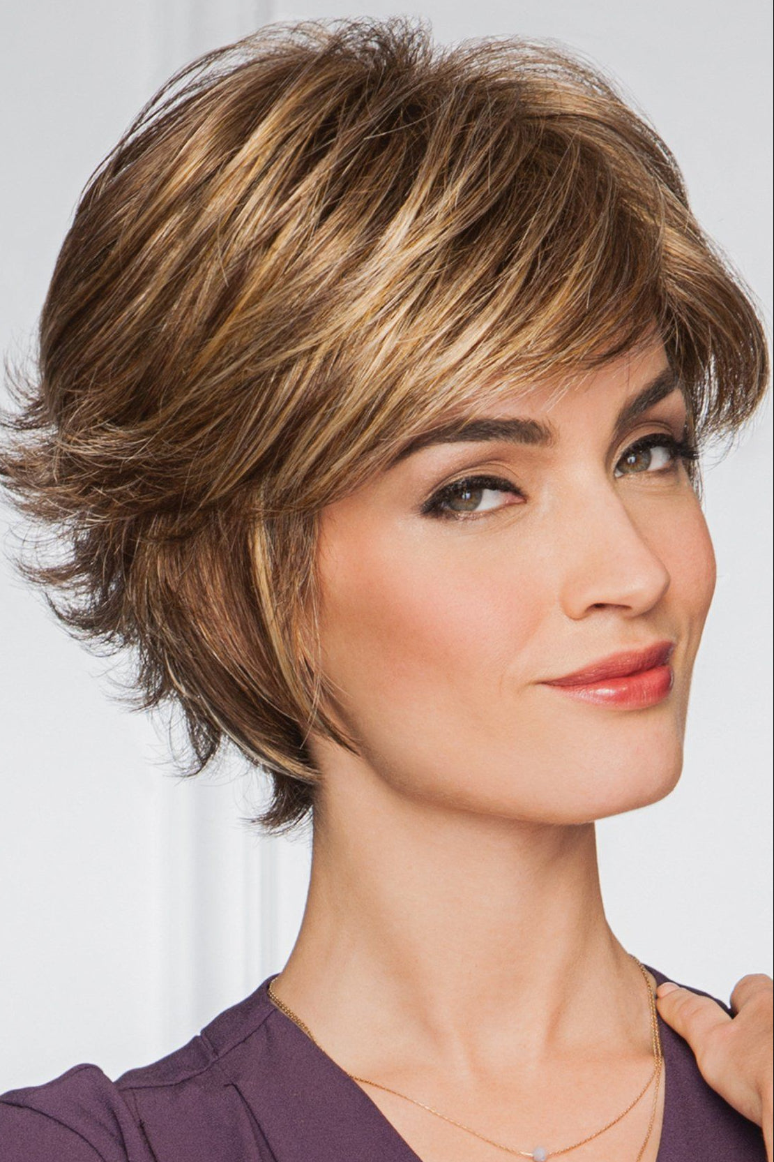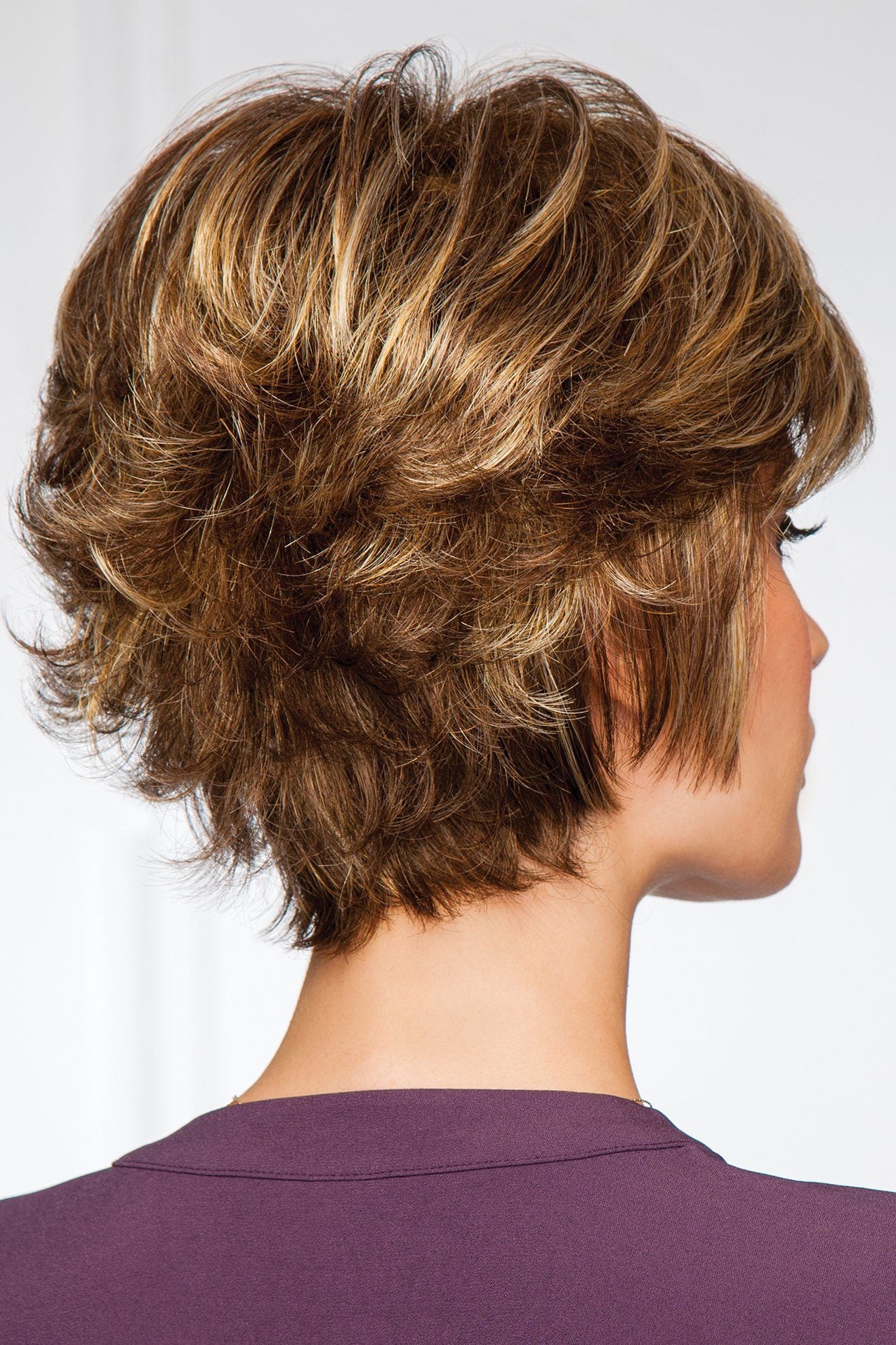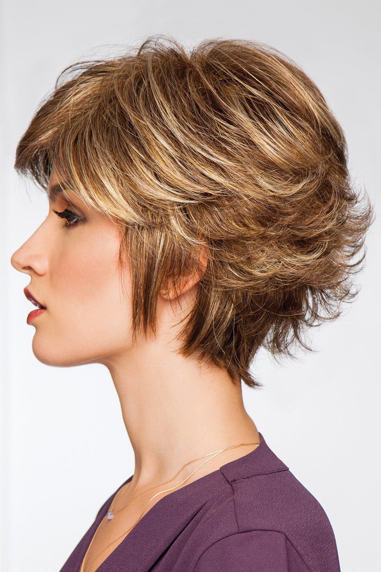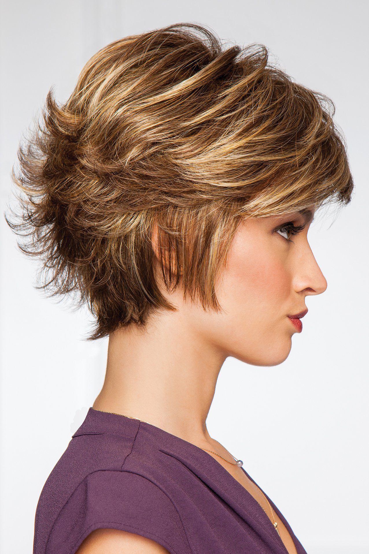 A full, barely waved top with short, textured layers in the sides and back transform a short basic style into a fresh, sophisticated wig.