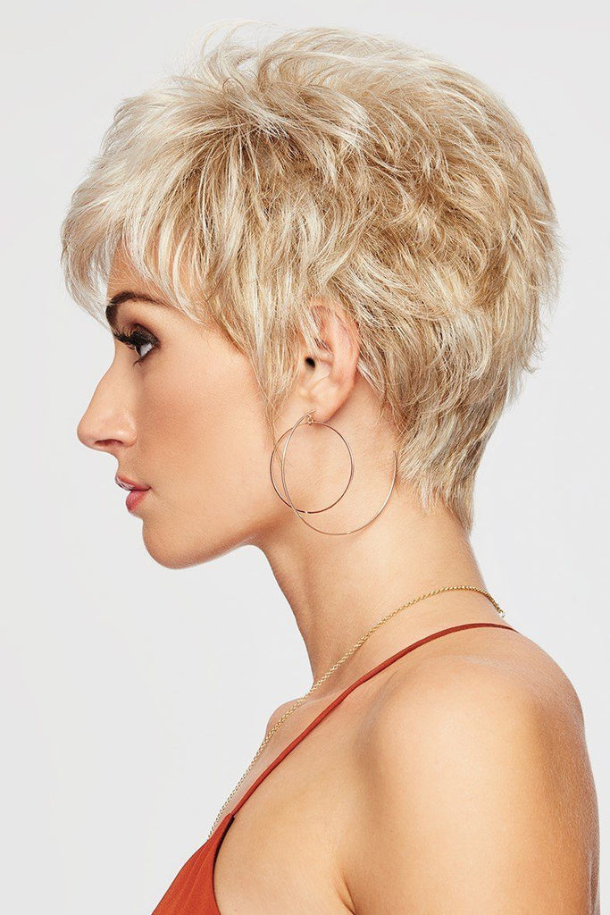 A short, face-framing cut wig that is texturized, layered and voluminous featuring a tapered neckline.