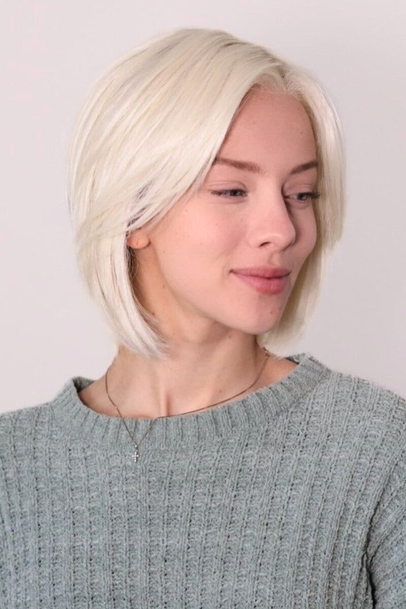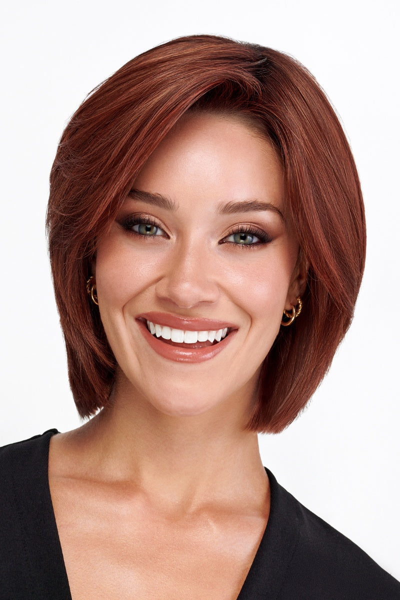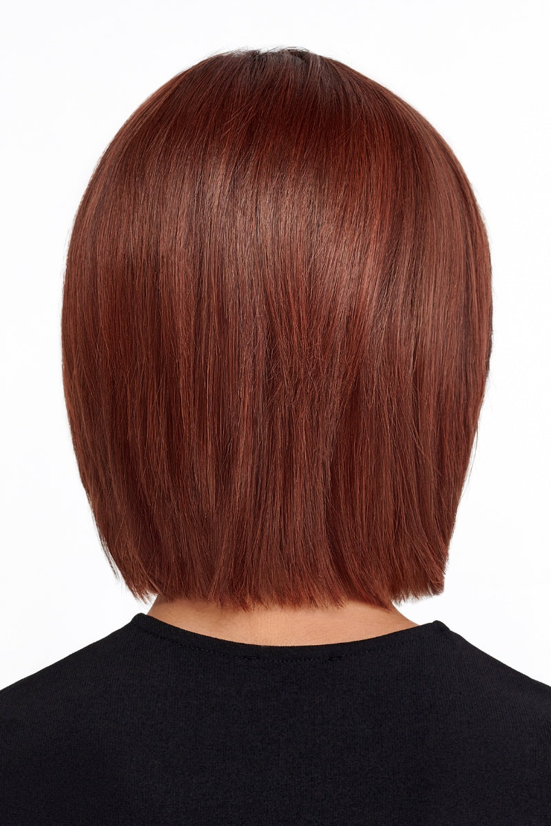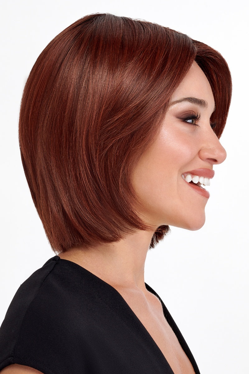 Sheer Joy is a low density silky layered bob with a very slight wave that falls just below the collar, that will part anywhere. Our Style-Able Effortless™ fiber matches the density of fine Human hair and is double knotted by hand into a soft sheer monofilament lace mesh top and lace front for a realistic undetectable hairline for all day, every-day comfort. Our unique Sheer Comfort cap is specially crafted so the hair appears to be growing right out of your scalp and hairline. Hand layering allows for a low density of hair but full coverage without any bulk or weight usually associated with wigs. Sheer Joy is made for anyone that prefers the versatility of low density style-able hair that can be brushed full or sleek and parts anywhere.