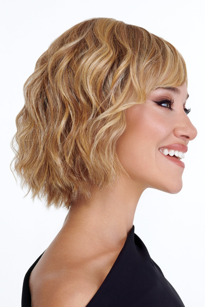 TressAllure's Trend features short textured layers of beach waves, silky feathered bangs, a smooth silky top, and bob back that falls above the collar. Featuring a Sheer Comfort Mono Top and Soft Lace Front that is double hand knotted for weightless comfort. Ear to Ear feathered bangs brush in any direction or off the face for an undetectable hairline and part. Blended multi-textures and sculpted layering frame narrows the face. Exquisite hand knotting gives you adjustable volume without any bulk for an incredible light-weight feel. And Style-Able Effortless™ Fiber lets you volumize, brush smooth or enhance your curls. TressAllure Trend is perfect for anyone looking for perfect length and combination of textures, waves and volume.